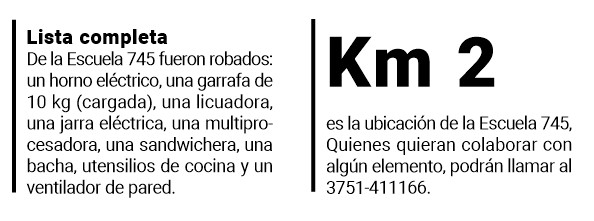 La directiva de la escuela ubicada en la zona oeste de esta ciudad, detalló que “se llevaron un horno eléctrico, una licuadora, una procesadora, una sandwichera, también una bacha que estaba en el lugar para la limpieza de los utensilios que se utilizan, elementos varios de cocina, como bandejas, fuentes de plástico y otros más que se emplean para elaborar distintos alimentos que se venden para recaudar fondos”.