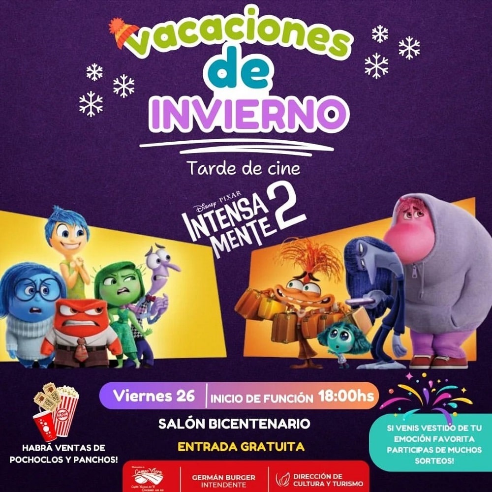 Este viernes, las 18 horas, se proyectará la película de animación “Intensamente 2”. En el Salón del Bicentenario. La entrada será libre y gratuita. Si asisten disfrazados o con el color de la emoción favorita participan de sorteos especiales.