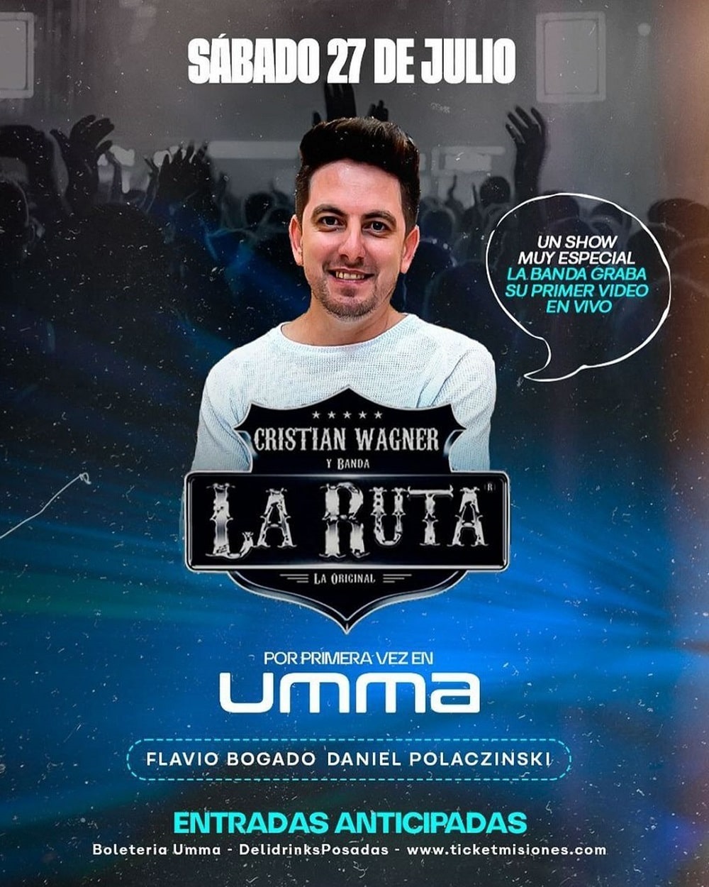 El sábado 27, Cristian Wagner y Banda La Ruta grabarán su primer videoclip en Posadas. Con la reciente publicación del tema Tu corazón, noche loca en plataformas será una noche a puro ritmo. Lugar: UMMA (Maipu 2260). Entradas: General $7.000. Premium frente al escenario $10.000. Premium VIP $20.000. Camarotes exclusivos para 10 personas: de una a cuatro $180.000, de cinco a ocho $150.000. Puntos de venta boletería de Umma y Ummita de 16 a 20. TicketMisiones.com.