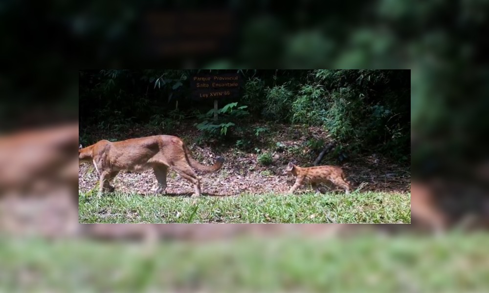 Una “fantástica escena” de una hembra puma junto a su cachorro fue capturada en el Parque Provincial Salto Encantado en Misiones.