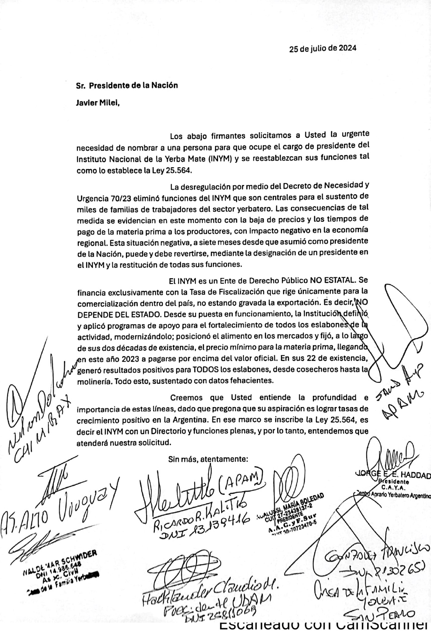 A Milei, le reclamaron el DNU: “La desregulación por medio del Decreto de Necesidad y Urgencia 70/23 eliminó funciones del INYM que son centrales para el sustento de miles de familias de trabajadores del sector yerbatero. Las consecuencias de tal medida se evidencian en este momento con la baja de precios y los tiempos de pago de la materia prima a los productores, con impacto negativo en la economía regional. Esta situación negativa, a siete meses desde que asumió como presidente de la Nación, puede y debe revertirse, mediante la designación de un presidente en el INYM y la restitución de todas sus funciones”, escribieron entidades como AAG y FSur, UDAM, APAM, Centro Agrario Yerbatero, Chimiray, Alto uruguay, Centro de la Familia Yerbatera, entre otros.