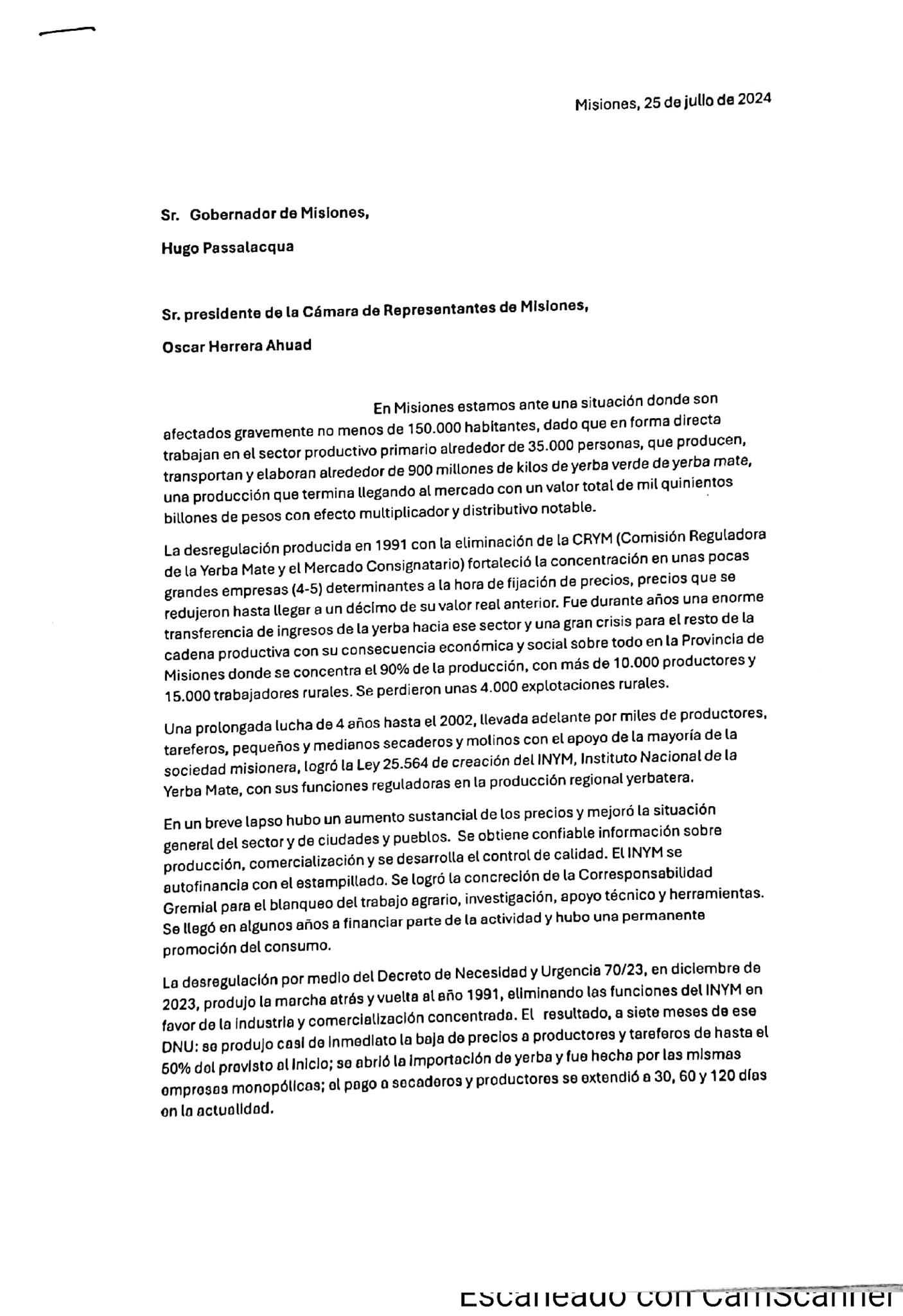 Finalmente fue cuando hicieron el pedido: “Es necesaria y urgente la Declaración de Emergencia Agropecuaria Yerbatera, la restitución de las condiciones de operación del INYM, con la inmediata designación de autoridades y funcionamiento del Directorio del INYM que se aboque a la concertación de precios. En el mismo sentido, prever la provisión por parte de Nación de los fondos para la Interzafra a los trabajadores rurales, pues estamos a pocos días de la terminación de cosecha, y fondos destinados a la recomposición de precios al productor”.