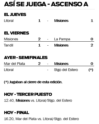 Misiones arrancó su camino en el certamen con un empate 1-1 ante Litoral, el último jueves. El viernes venció por 2-0 a La Pampa y luego 2-1 a Tandil, y por diferencia de goles se ubicó en la segunda posición de la Zona A, por lo que le tocó medirse con Mar del Plata, que terminó primero en la Zona B. Hoy irá por el podio.