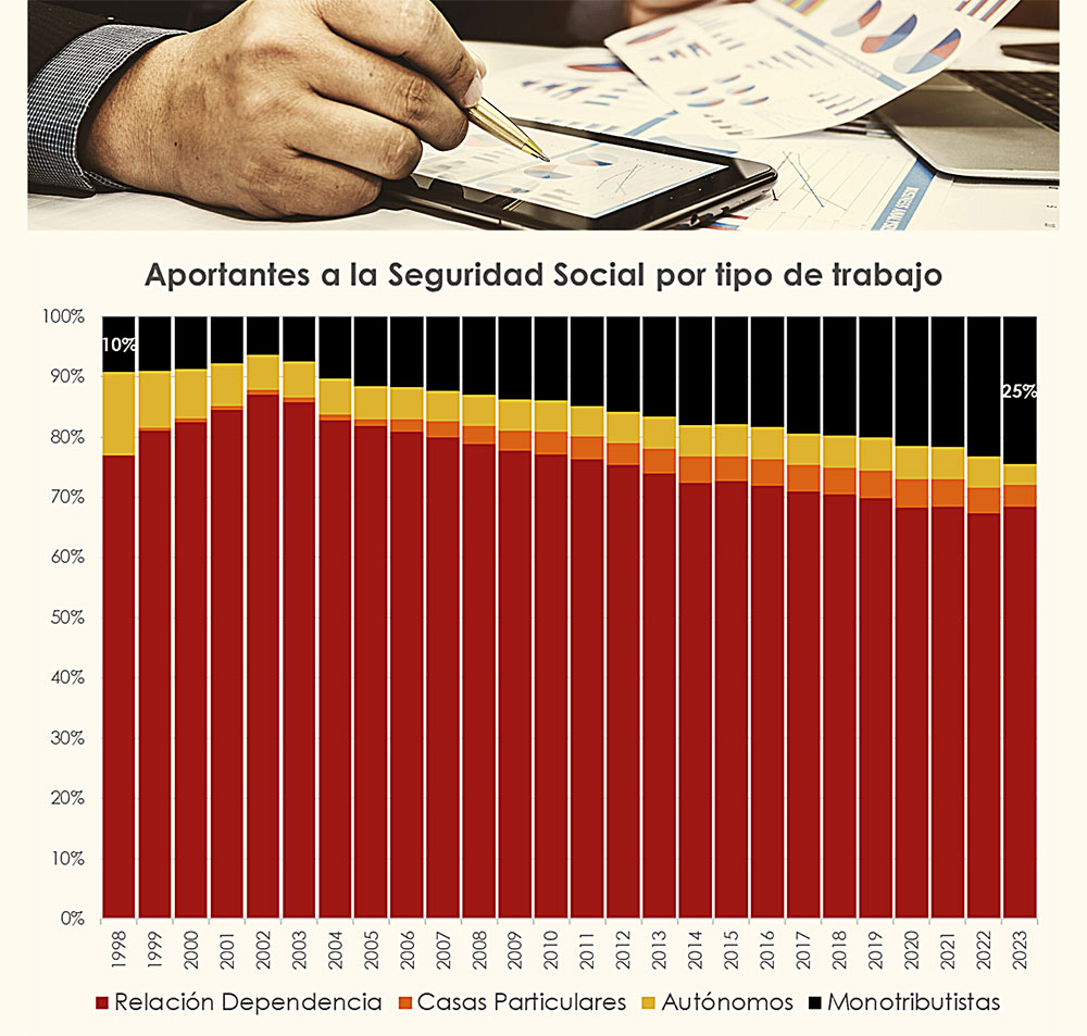 Según el economista Julián Folgar, el último dato de 2023 fue de 4,9 millones de monotributistas, de los cuales casi la mitad, 2,5 millones, aportan a la seguridad social. Hace 20 años, apenas eran 370.000 los monotributistas con aportes a la seguridad social.