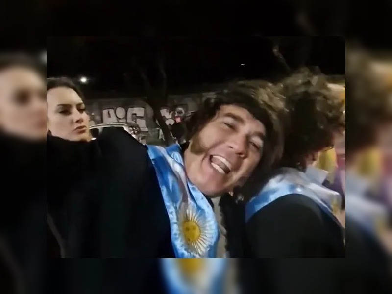 Los tres hombres, vestidos como Milei, interpretaron “Panic Show” de La Renga, canción que suele sonar en los actos del presidente. En el video publicado por Oría, se puede ver a dos de los imitadores luciendo trajes con la banda presidencial, mientras que el tercero llevaba una clásica campera de cuero, fiel a uno de los estilos característicos del Presidente.