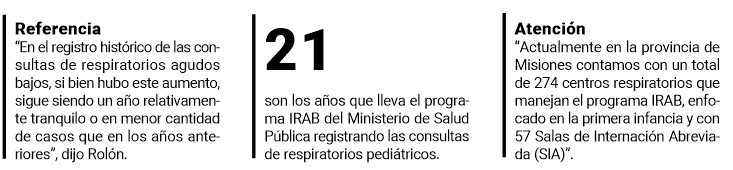 Rolón detalló que “en las semanas 28, 29 y 30 empezó a crecer la curva, haciendo un pico. Fue así que subimos a 172, después a 192 hasta llegar a 220 casos de síndrome bronquial obstructivo en esta última semana, epidemiológicamente la número 30. Esas tres semanas las situamos en las de pre-vacaciones y vacaciones invierno. No sabemos si va a seguir aumentando la cantidad de casos y dónde, pero donde más aumentaron los casos fue en la guardia del Hospital de Pediatría”.