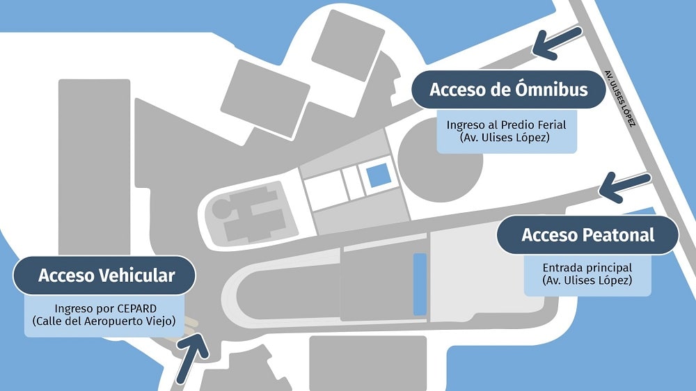 A partir de las 8 abrirán los portones de ingreso al Parque del Conocimiento, por la avenida Ulises López, Acceso Oeste. Mientras que los vehículos particulares podrán acceder únicamente por la avenida José Sorsana, frente al CePARD. Hasta las 15 horas se permitirá el ingreso de colectivos y combis al predio ferial (por avenida Ulises López, metros antes del acceso principal).