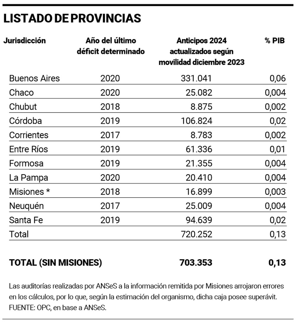 Se identifica a Buenos Aires, Chaco, Chubut, Córdoba; Corrientes, Entre Ríos, Formosa, La Pampa, Neuquén y Santa Fe como las deficitarias. Y se establece que hubo adelantos por 703 mil millones de pesos de la Nación en concepto de compensaciones por los déficit.