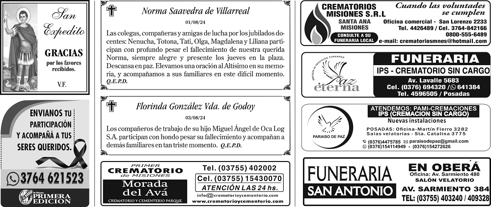 • Fúnebres del Sábado 3 de Agosto de 2024