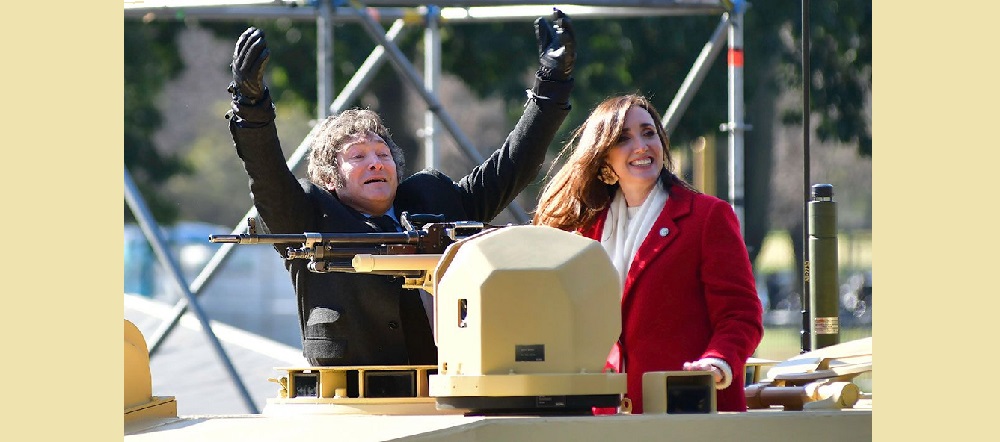 Ese día coronó el desfile militar subiéndose a un tanque de guerra junto con Victoria Villarruel, quien representa en la estructura de La Libertad Avanza los intereses políticos de los militares.