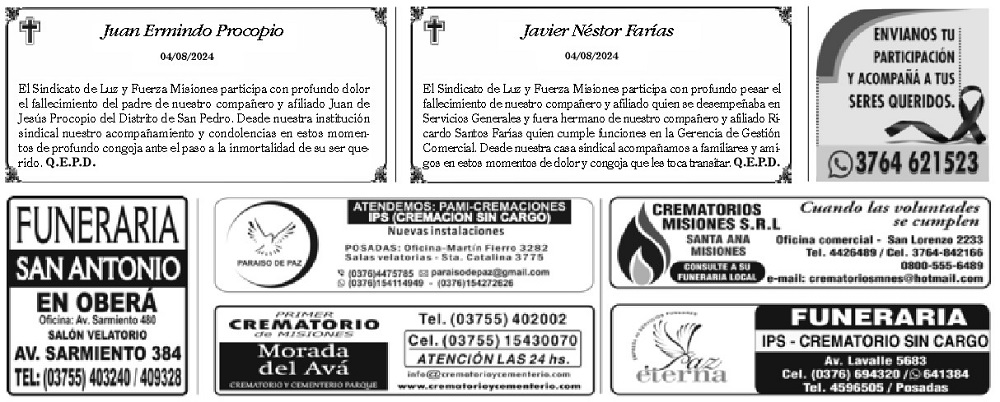 • Fúnebres del Sábado 3 de Agosto de 2024