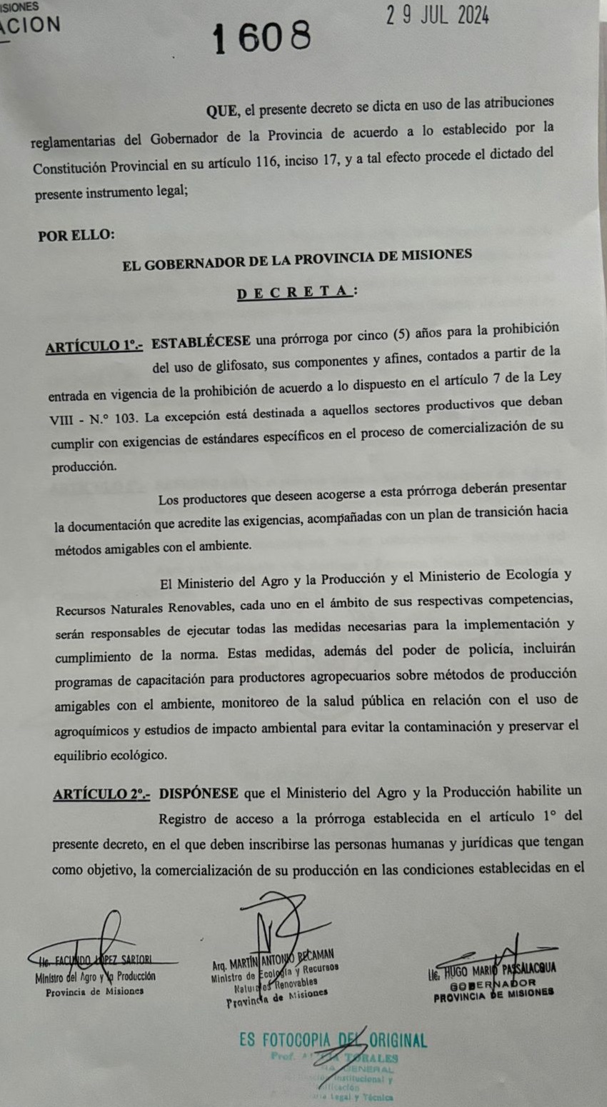 La norma conocida ahora cuenta con las firmas de los ministros del Agro y Ecología, Facundo López Sartori y Martín Recamán, además del gobernador Hugo Passalacqua.