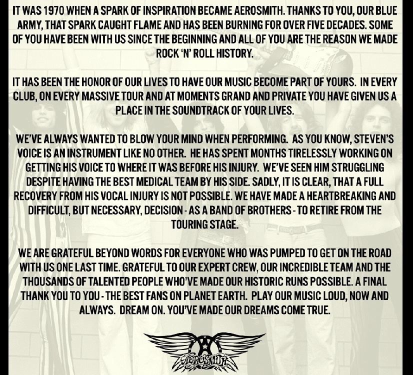 La legendaria banda de rock estadounidense Aerosmith ha anunciado la cancelación definitiva de su gira “Peace out Tour” por los problemas vocales de su líder Steven Tyler, según anunciaron en un mensaje en su Instagram oficial.