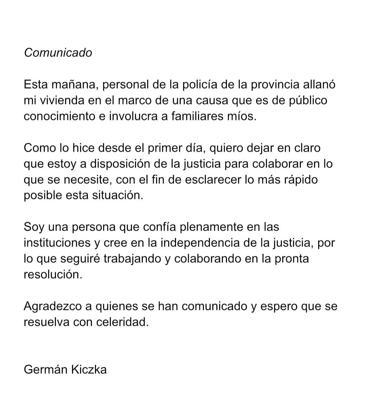 En un escueto comunicado, el dirigente de Activar, partido fundado por su amigo y líder político Pedro Puerta, no hizo referencia en ningún momento a las contundentes pruebas que la Justicia habría encontrado en el domicilio, principalmente en su celular y en su notebook que fueron secuestrados.