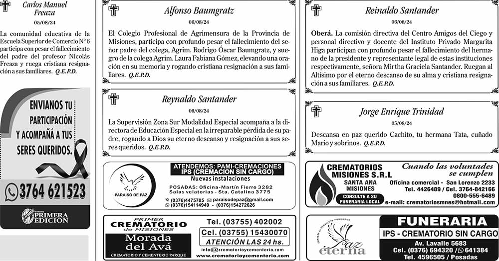 • Fúnebres del Sábado 3 de Agosto de 2024
