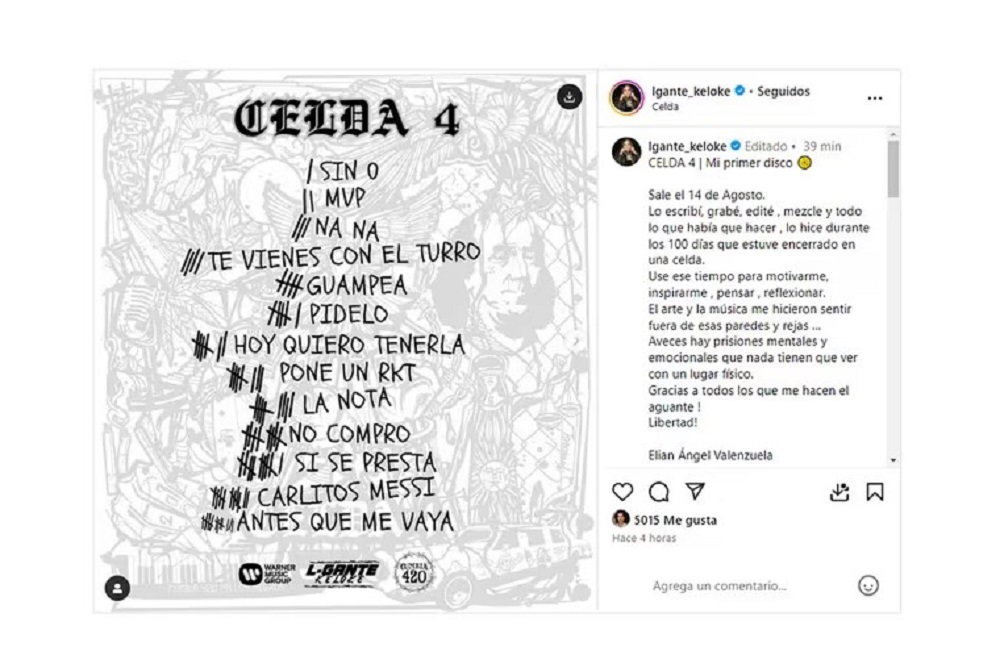 La noticia fue compartida por el propio compositor de cumbia 420 a través de las redes sociales. Junto a una imagen de los temas que grabó para este lanzamiento, el intérprete de “Cumbia Mafia 420″ escribió: “Celda 4. Mi primer disco. Sale el 14 de agosto”. En esa misma línea, se explayó: “Lo escribí, grabé, edité, mezclé y todo lo que había que hacer, lo hice durante los 100 días que estuve encerrado en una celda. Usé ese tiempo para motivarme, inspirarme, pensar, reflexionar. El arte y la música me hicieron sentir fuera de esas paredes y rejas…”.