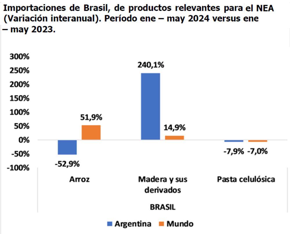 En cuanto a las importaciones de Brasil comparando el período enero – mayo del 2024 versus igual período del año anterior, se observa que la madera y sus derivados crecieron un 240,1% (pasando de US$ 1,3 millones a US$ 4,3 millones en el período analizado), el Arroz cayó un 52,9% (pasando de US$ 20 millones a US$ 9,4 millones en el período analizado), y la pasta celulósica cayó un 7,9% (pasando de US$ 33,4 millones a US$ 30,8 millones en el período analizado).