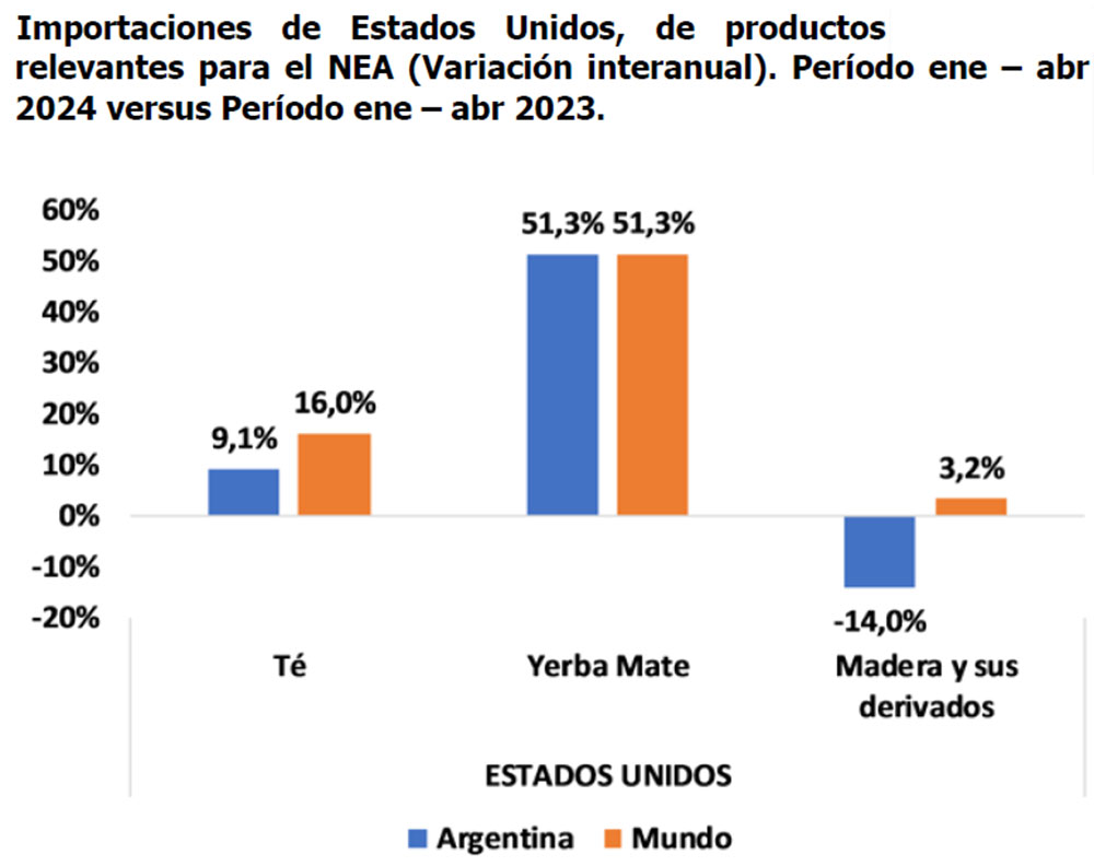 En tanto, respecto a las compras de Estados Unidos de productos de Argentina, se observa que el té registró un incremento del 9,1% (pasando de US$ 20,2 millones a US$ 22,1 millones), y la yerba mate creció un 53,3% (de US$ 0,7 millones a US$ 1 millón); mientras que la madera y sus derivados cayeron un 14% (de US$39,7 millones a US$34,1 millones).