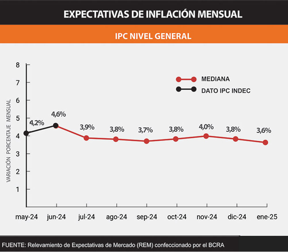El plan del equipo económico es mantener un estricto control sobre los agregados monetarios y de esta manera acelerar la caída de la inflación mensual. En julio, de hecho, el REM espera que el índice perfore el 4% mensual (se estima que dará finalmente 3,9%), mientras que algunas consultoras estiman que la disminución podría llegar al 3,5%.