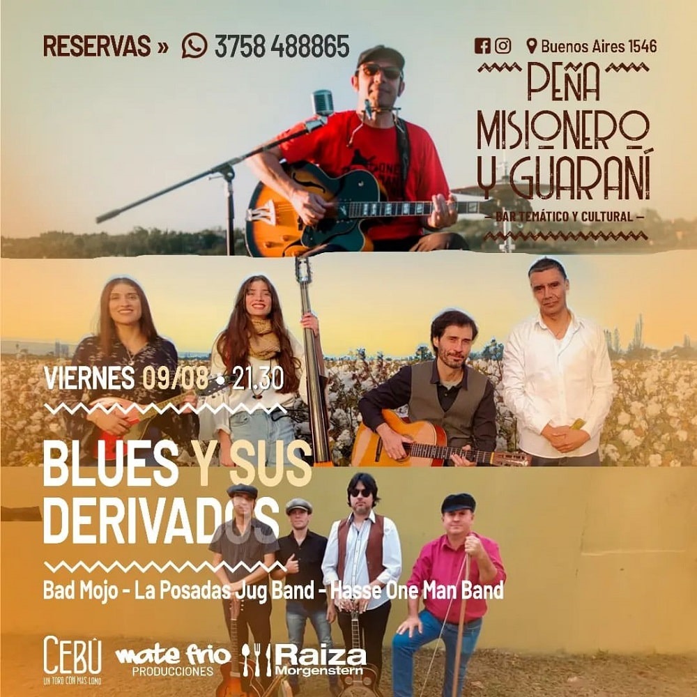 Este viernes, a las 21,30 horas actuarán en la Peña Misionero y Guaraní (Buenos Aires 1546), de Posadas, Hasse One Man Band, Bad Mojo y La Posadas Jug Band, quienes brindarán una noche lleno de Blues. Entrada: $3.000. Reservas al +54 3758 488865.
