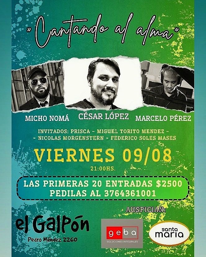 Este viernes, a las 21, César López presenta canciones emblemáticas del rock nacional y del folclore, un cancionero popular y canciones propias. La cita será en el Galpón de la Murga de la Estación (Pedro Méndez 2260), Posadas. Entradas: al 376 4361001 (César).