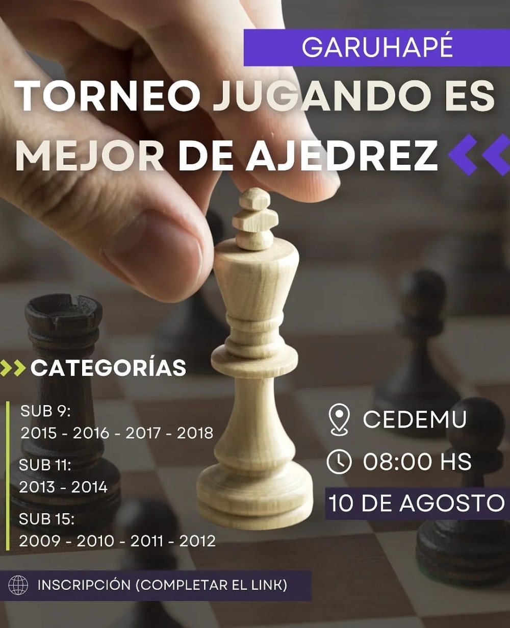 El sábado a las 8 horas, llega la tercera fecha del Torneo Jugando es Mejor en la disciplina ajedrez en el Centro Deportivo Municipal de Garuhape. Entrada libre con inscripción previa.
