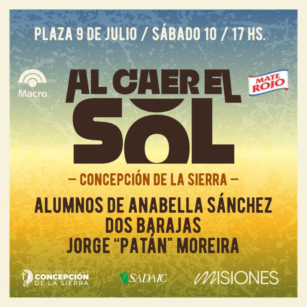 En Concepción de la Sierra, al cierre de Connatural, se presentarán Alumnos de Anabella Sánchez, Dos Barajas y Jorge Patán Moreira. Este encuentro será el sábado 10 de agosto en la Plaza 9 de julio, desde las 17 horas.