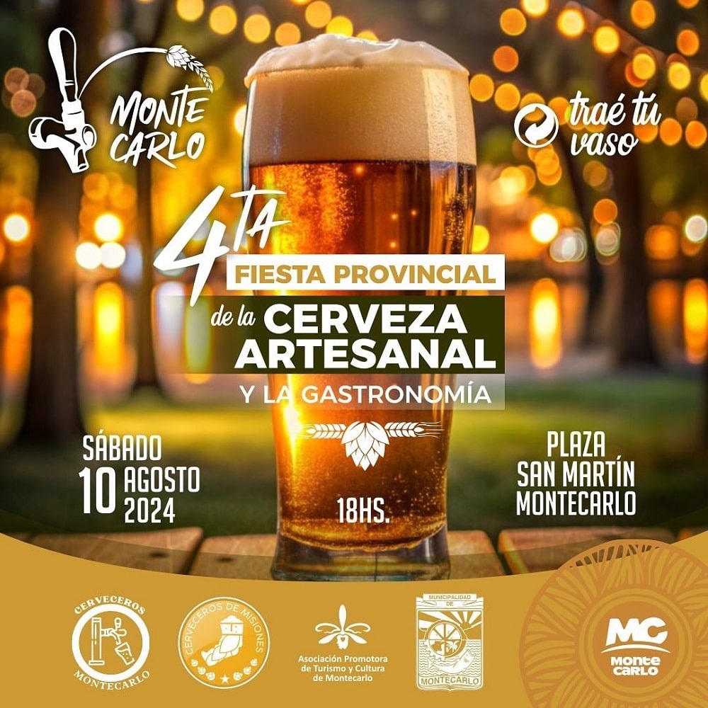 El sábado, a partir de las 18 horas, cerveceros de distintas localidades de la provincia ofrecerán sus producciones de cerveza artesanal en la Plaza San Martín. Si llevás tu vaso se contamina menos el ambiente. La entrada será libre. Contacto con los organizadores de la Asociación Promotora de Turismo Montecarlo: 3751 419353 – 3751 669088.