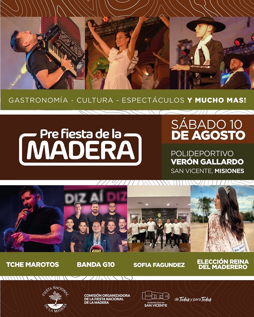 Este sábado, a las 21, se realizará la previa hacia una nueva edición de la Fiesta Nacional de la Madera en el Polideportivo Verón Gallardo (Florencio Sánchez y María Eva Duarte). Se presentarán Tche Marotos, Sofía Fagundez y Banda G10. También se elegirá a la Reina Municipal de los Madereros. Entradas en venta en la Municipalidad de San Vicente.
