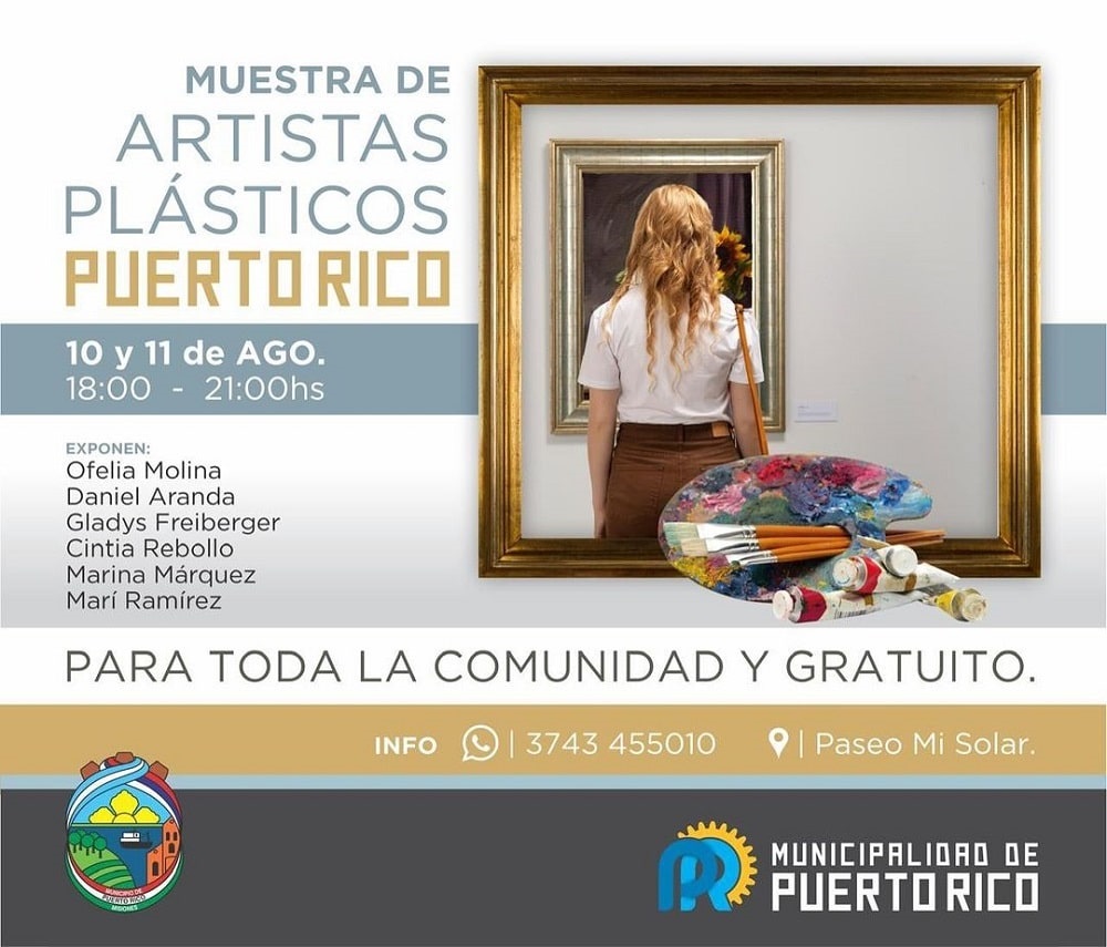 Este sábado y domingo, de 18 a 21 horas, se desarrollará la cuarta muestra de artistas plásticos de la ciudad de Puerto Rico en el Paseo Solar. Exponen: Ofelia Molina, Daniel Aranda, Gladys Freiberger, Cinthia Rebollo, Marina Márquez y Marí Ramírez. La entrada es libre.