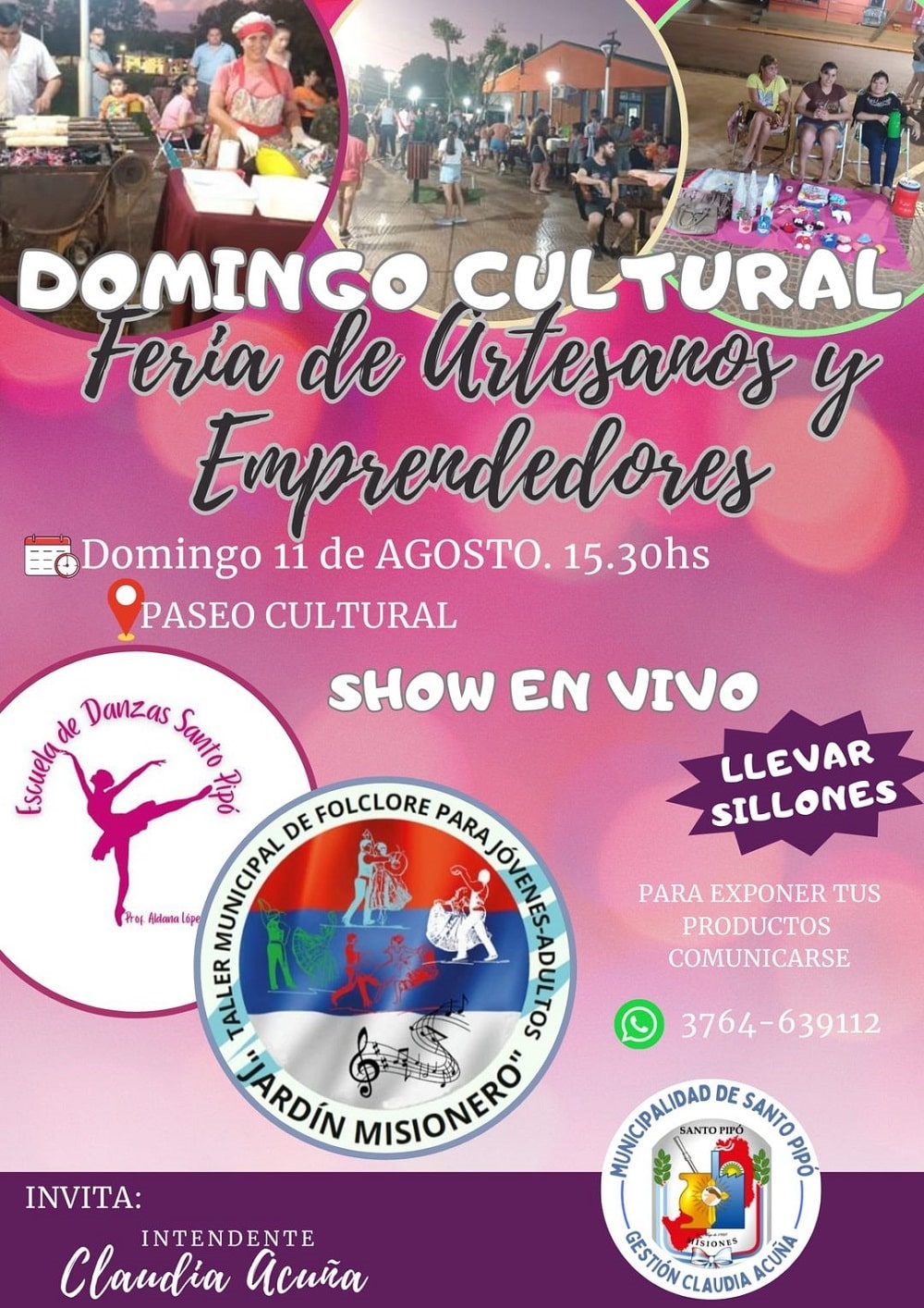 Éste domingo, a las 15.30 horas, se realizará el Domingo Cultural, en el Paseo Cultural de Santo Pipó con expositores, emprendedores y música en vivo. Llevar sillones y muchas ganas de compartir. Entrada es libre y gratuita.