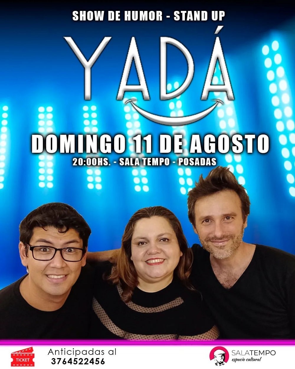 Este domingo, a las 20, el Grupo Yadá presenta una noche de humor y palabras en la Sala Tempo (Ramón García 554), de Posadas. Entradas: anticipadas 1 x $5.000 – 2 x $9.000 – 3 x $12.000 Consultas y reservas al 376 4522456.