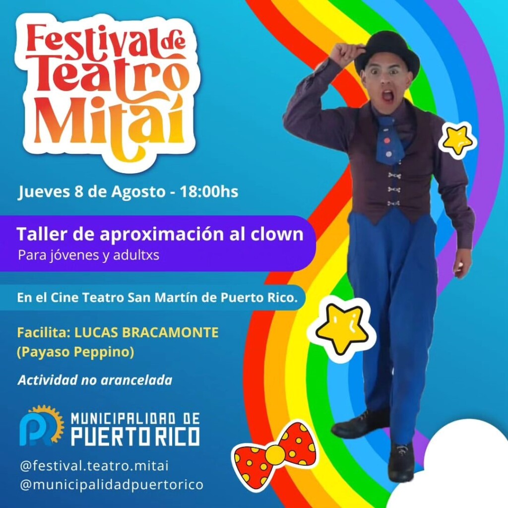En el marco del Festival de Teatro Mitaí, Lucas Bracamante, conocido como Payaso Pepino, brindará un taller para jóvenes y adultos, este jueves, a las 18 horas, en el Cine teatro San Martín de Puerto Rico. El taller incluirá Trabajo de Clown, método Lecoq; Disociación y Ritmo y Comicidad e Improvisación. La entrada será libre.