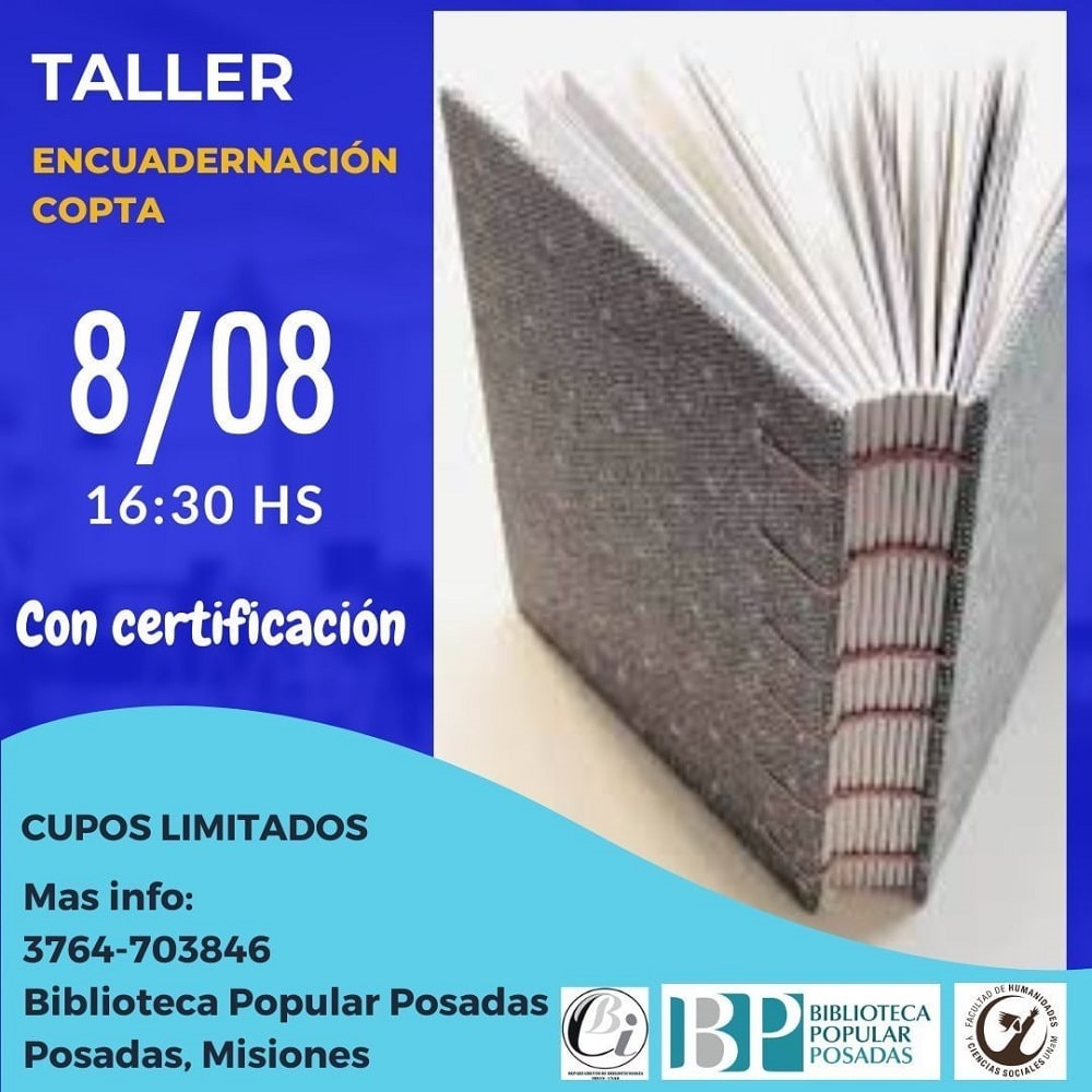 Este jueves a partir de las 18.30, en la Biblioteca Popular Posadas (Córdoba 2069), se desarrollará un curso para aprender a realizar un cuaderno artesanal con la milenaria técnica egipcia o copta. El costo del taller incluye los materiales y herramientas a utilizar en la confección del cuaderno. Con certificación de la UnaM. Entrada: $15.000 para público en general. $12.000 para estudiantes, jubilados y socios de la Biblioteca. Descuentos para socios de la Fundación de la Facultad de Humanidades y Ciencias Sociales. Más información: 376 4703846 o [email protected].