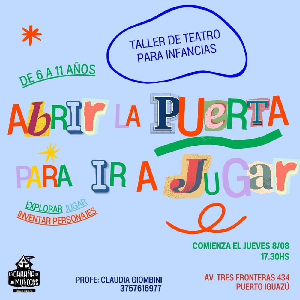 Todos los jueves, de 17,30 a 19 horas, se realizará el taller de teatro Abrir la puerta para ir a jugar, en la Cabaña de los Muñecos (Avenida Tres Fronteras 434). El mismo estará destinado a niñas y niños de 6 a 11 años. Inscripciones: al 3757 616977 (Claudia).