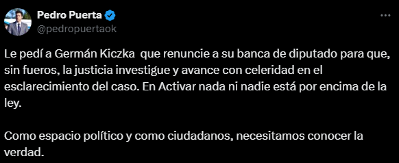 Este viernes en horas del medio día, el diputado provincial Pedro Puerta, a través de su cuenta de “X” y citando un comunicado del espacio político “Activar”, el cual lidera, comunicó que le pidió a Germán Kiczka que renuncie a su banca de diputado en la Cámara de Representantes de la provincia de Misiones.