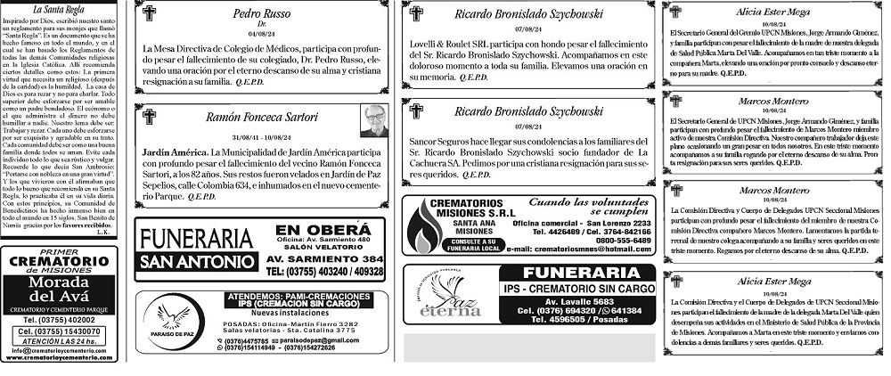 • Fúnebres del Sábado 10 de Agosto de 2024