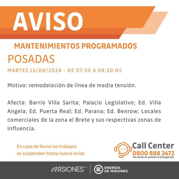 La medida afectará durante este martes 13 de agosto a varios barrios de Posadas.