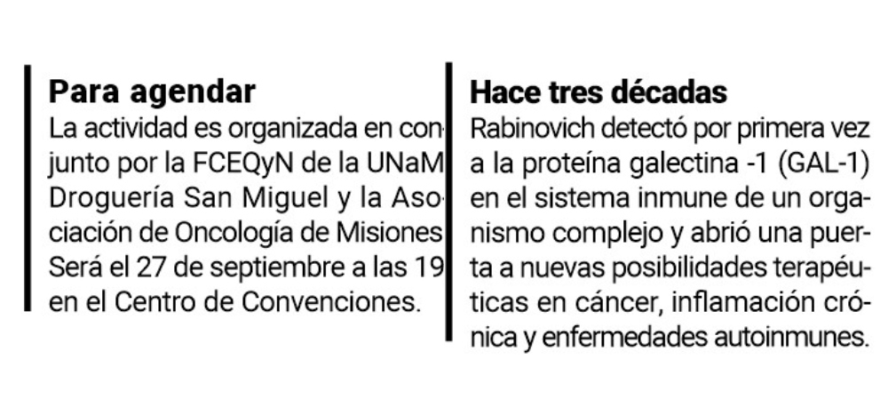 Se anunció oficialmente la conferencia que brindará en el Centro de Convenciones de esta ciudad, el doctor Gabriel Rabinovich, investigador superior del Consejo Nacional de Investigaciones Científicas y Técnicas (CONICET), reconocido en el mundo por un hallazgo que revolucionó las terapias contra el cáncer. “Rabinovich es una personalidad científica que hace grandes aportes a la salud humana y pensando en la población en general”, señaló el decano de la Facultad de Exactas, Dardo Martí, durante la presentación realizada el miércoles en el Módulo de Bioquímica y Farmacia de la Universidad Nacional de Misiones (UNaM) y con miras al 27 de septiembre venidero.