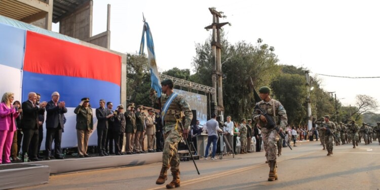 Para culminar, el Gobernador Passalacqua autorizó el inicio del desfile cívico-militar. Las banderas de ceremonia y de guerra se colocaron a la cabecera de la formación, marcando el inicio del desfile, que fue acompañado por los aplausos del público presente. Durante el mismo, participaron diversas instituciones educativas, fuerzas de seguridad y veteranos de guerra, quienes desfilaron con orgullo por las calles de Puerto Iguazú.