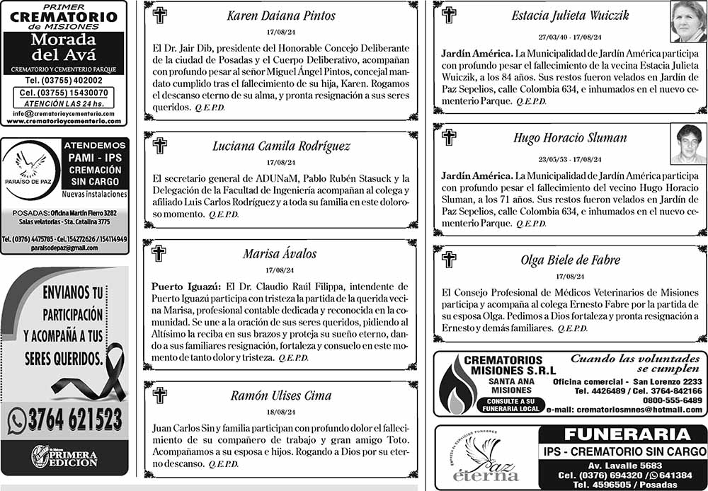 • Fúnebres del Domingo 18 de Agosto de 2024