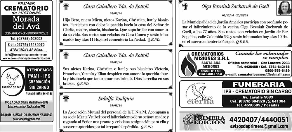 • Fúnebres del Domingo 18 de Agosto de 2024