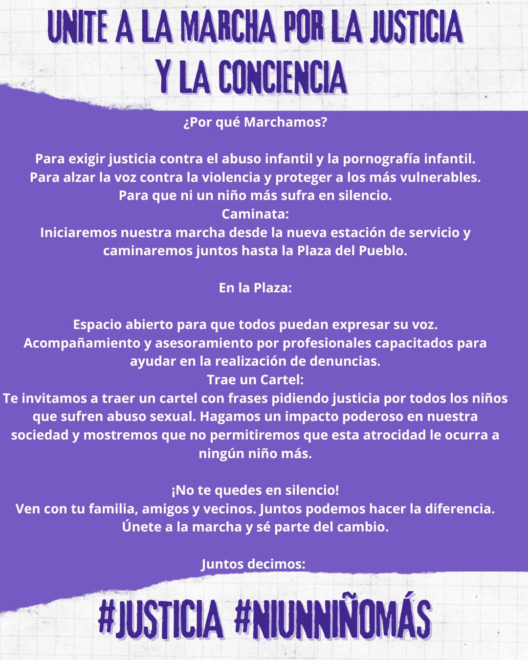 Julia Pereyra, una de las organizadoras, contó que “estamos convocando a las comunidades de las iglesias y también de otros municipios. Más que una marcha en realidad es una campaña de concientización. También vamos a informar a la gente a qué lugares pueden ir a denunciar este tipo de delitos, y que alcen la voz por los más vulnerables”, sostuvo.
