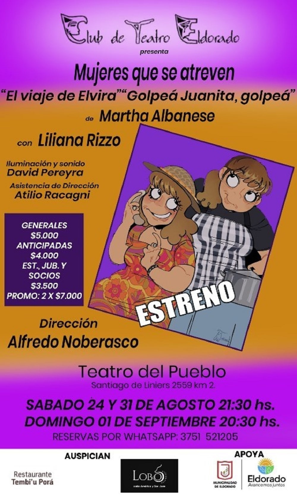 “La puesta en escena apunta a introducirnos en el aquí y ahora; pasiones, necesidades e intereses de dos mujeres en una sociedad que en general no las completas”, expresa parte del resumen del director Alfredo Noberasco, en referencia al espectáculo teatral “Mujeres que se atreven”, que reúne a los monólogos: “El viaje de Elvira” y Golpeá Juanita, golpeá”.