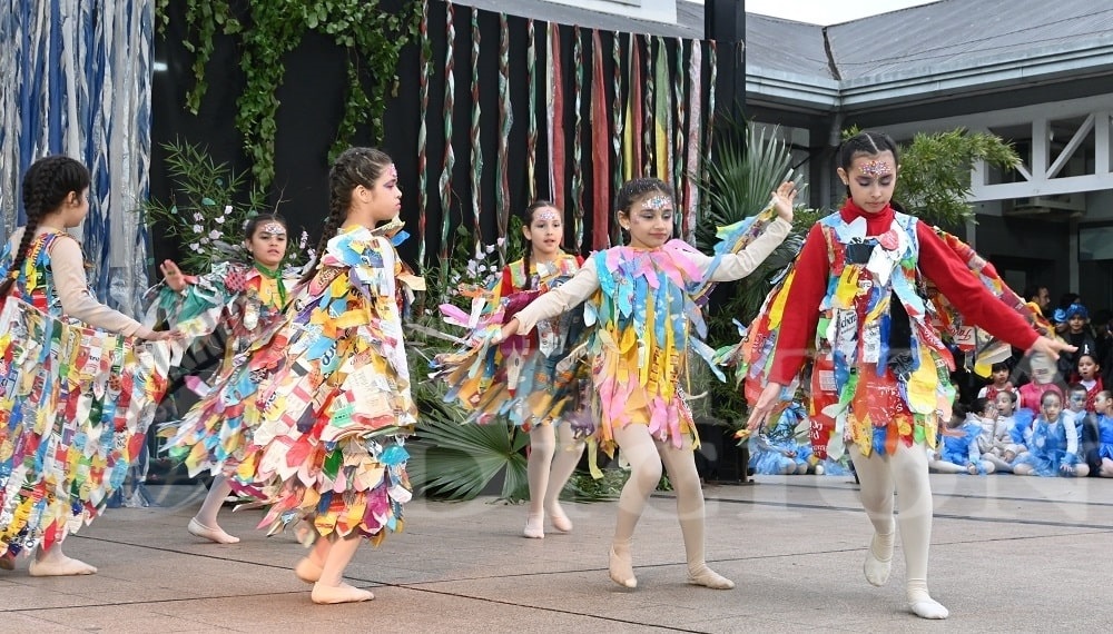 Una jornada cargada de música, baile y un profundo mensaje de concientización sobre el cuidado del medioambiente, que estuvo a cargo de 150 alumnos de los niveles iniciales y pre-iniciales, quienes vistieron atuendos hechos con material reciclable y estuvieron acompañados de sus profesores.