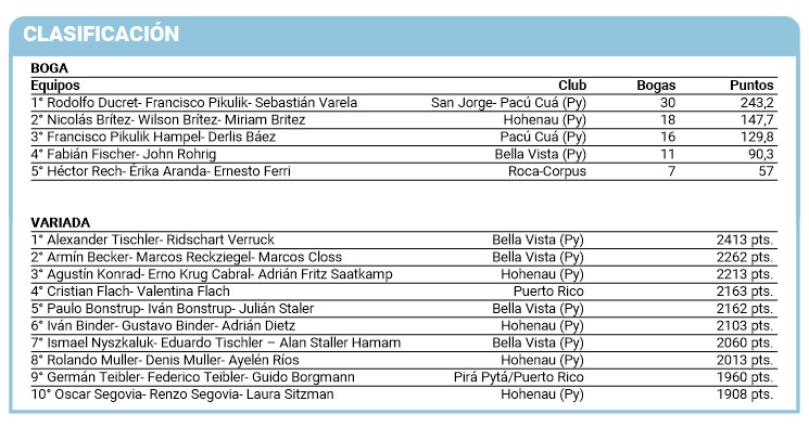 En la pesca de la boga, el entrerriano Rodolfo Ducret junto a su comprovinciano Sebastián Varela y el encarnaceno Francisco Pikulik demostraron que son verdaderos especialistas en esta especie. Los ganadores finalizaron la doble jornada con 30 capturas, doce más que sus escoltas.