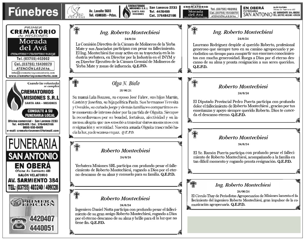 • Fúnebres del Sábado 24 de Agosto de 2024
