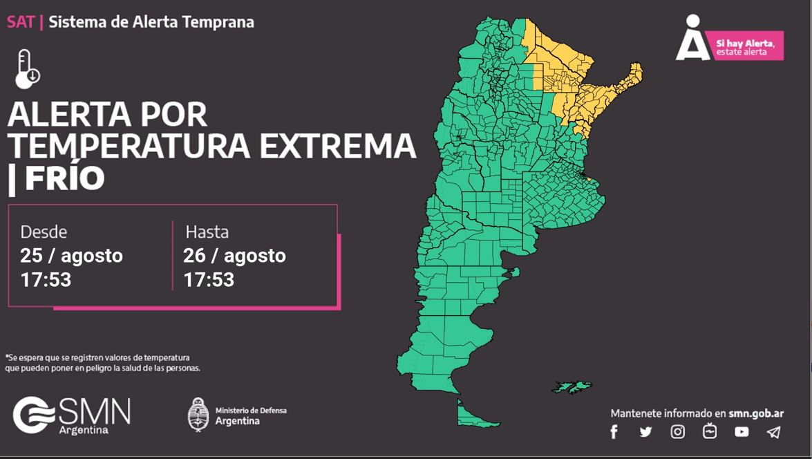 Misiones se encuentran en una nueva alerta amarilla por frío extremo, según informó el Servicio Meteorológico Nacional (SMN) este domingo por la tarde.