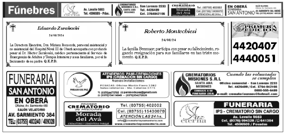 • Fúnebres del Sábado 24 de Agosto de 2024