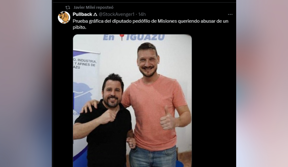 Javier Milei compartió un tuit de un usuario que subió una foto de Martín Tetaz junto al diputado provincial de Misiones Germán Kiczka, prófugo e investigado por poseer material de pedofilia.